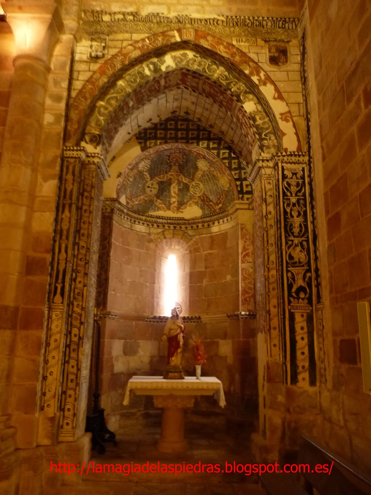 La cabecera del templo la componen los tres cilindros absidales que cierran sus respectivas naves hacia levante. De mayor diámetro y altura el central, lucen los tres ventanal rehundido centrándolos. Contrafuertes prismáticos refuerzan su estructura. Dos en el central y uno en cada uno de los laterales. Alcanzan hasta el borde superior de los ventanales y en el caso del central se continúan por medio de otro tramo de menor sección hasta el propio alero. Canecillos esculpidos contribuyen a sustentarlo.